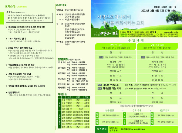 2022년 3월 6일 주보 (가야예배당) 페이지 정보 작성자 관리지기 작성일22-03-05 11:40 조회5,437회 댓글0건 관련링크 목록 본문 2022년 3월 6일 주보 (가야예배당) 댓글목록 등록된 댓글이 없습니다. 목록