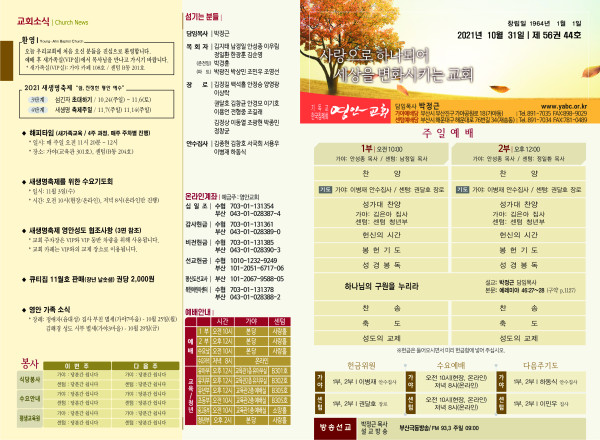 2021년 10월 31일 주보 페이지 정보 작성자 관리지기 작성일21-10-30 10:43 조회6,564회 댓글0건 관련링크 목록 본문 *2021년 10월 31일 주보 댓글목록 등록된 댓글이 없습니다. 목록