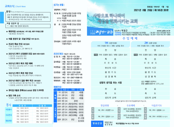 2021년 8월 29일 주보 페이지 정보 작성자 관리지기 작성일21-08-28 11:39 조회6,252회 댓글0건 관련링크 목록 본문 *2021년 8월 29일 주보 댓글목록 등록된 댓글이 없습니다. 목록