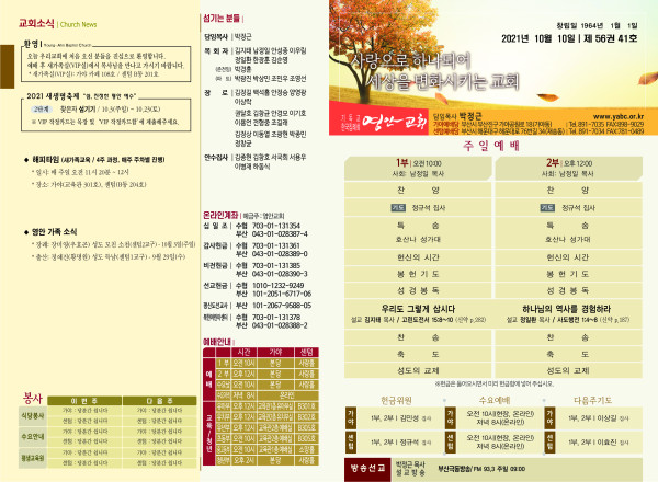 2021년 10월 10일 주보 (센텀예배당) 페이지 정보 작성자 관리지기 작성일21-10-08 13:54 조회6,319회 댓글0건 관련링크 목록 본문 *2021년 10월 10일 주보 (센텀예배당) 댓글목록 등록된 댓글이 없습니다. 목록
