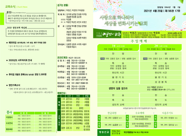 2021년 4월 25일 주보 페이지 정보 작성자 관리지기 작성일21-04-24 11:33 조회7,011회 댓글0건 관련링크 목록 본문 *2021년 4월 25일 주보 댓글목록 등록된 댓글이 없습니다. 목록
