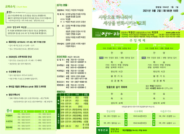 2021년 5월 2일 주보 페이지 정보 작성자 관리지기 작성일21-05-01 09:31 조회6,773회 댓글0건 관련링크 목록 본문 *2021년 5월 2일 주보 댓글목록 등록된 댓글이 없습니다. 목록