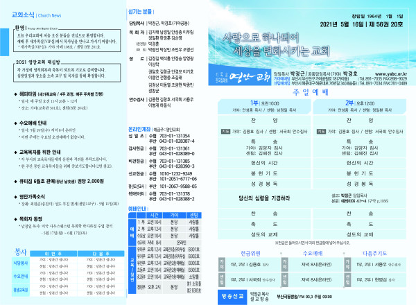 2021년 5월 16일 주보 페이지 정보 작성자 관리지기 작성일21-05-15 11:44 조회6,743회 댓글0건 관련링크 목록 본문 *2021년 5월 16일 주보 댓글목록 등록된 댓글이 없습니다. 목록