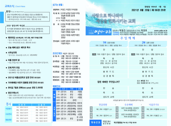 2021년 6월 20일 주보 페이지 정보 작성자 관리지기 작성일21-06-19 11:04 조회6,676회 댓글0건 관련링크 목록 본문 *2021년 6월 20일 주보 댓글목록 등록된 댓글이 없습니다. 목록