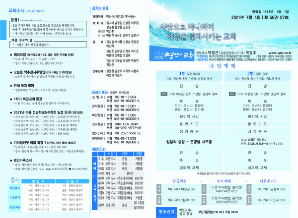 2021년 7월 4일 주보 페이지 정보 작성자 관리지기 작성일21-07-03 11:13 조회7,079회 댓글0건 관련링크 목록 본문 *2021년 7월 4일 주보 댓글목록 등록된 댓글이 없습니다. 목록