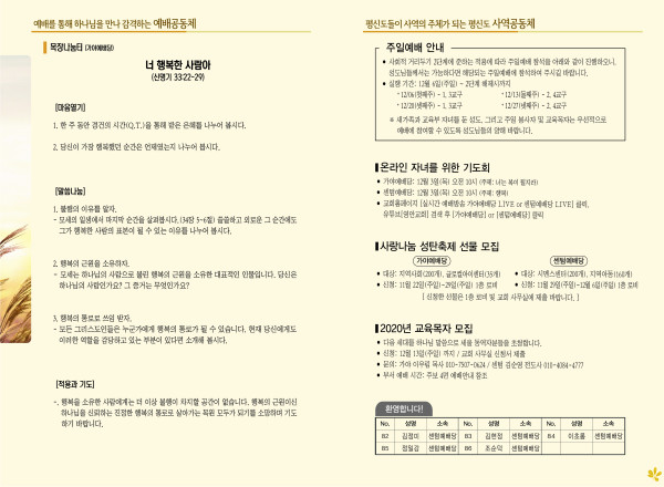 2020년 11월 29일 주보(가야예배당) 페이지 정보 작성자 관리지기 작성일20-11-28 13:00 조회7,484회 댓글0건 관련링크 목록 본문 2020년 11월 29일 주보(가야예배당) 댓글목록 등록된 댓글이 없습니다. 목록