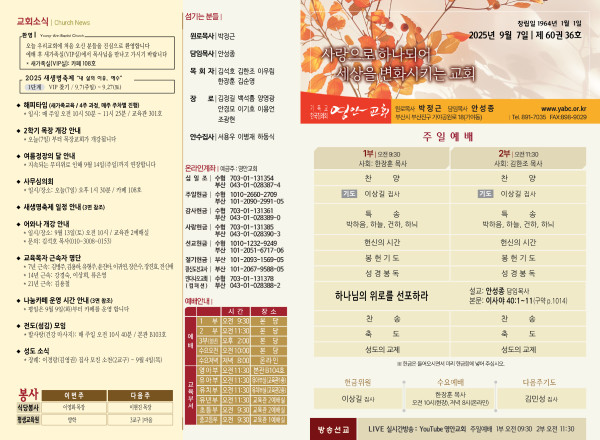 2025년 9월 7일 주보 페이지 정보 작성자 관리지기 작성일25-09-06 10:12 조회1,757회 댓글0건 관련링크 목록 본문 2025년 9월 7일 주보 댓글목록 등록된 댓글이 없습니다. 목록