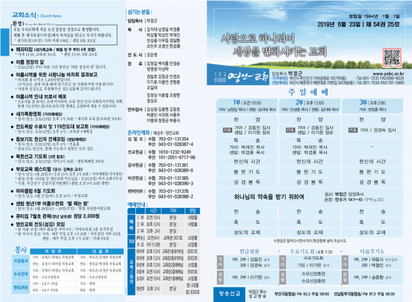 2019년 6월 23일 주보 페이지 정보 작성자 관리지기 작성일19-06-22 11:33 조회9,488회 댓글0건 관련링크 목록 본문 [2019년 6월 23일 주보] 댓글목록 등록된 댓글이 없습니다. 목록