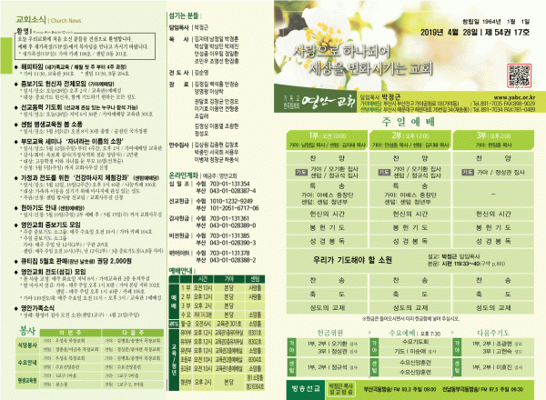 2019년 4월 28일 주보 페이지 정보 작성자 관리지기 작성일19-04-27 13:03 조회9,445회 댓글0건 관련링크 목록 본문 [2019년 4월 28일 주보] 댓글목록 등록된 댓글이 없습니다. 목록