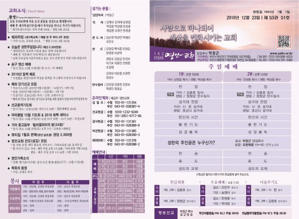 2018년 12월 23일 주보 페이지 정보 작성자 관리지기 작성일18-12-22 12:09 조회10,207회 댓글0건 관련링크 목록 본문 [2018년 12월 23일 주보] 댓글목록 등록된 댓글이 없습니다. 목록