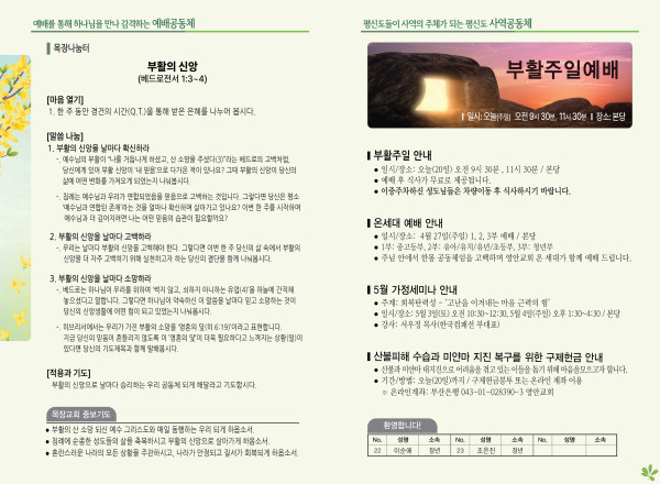 2025년 4월 20일 주보 페이지 정보 작성자 관리지기 작성일25-04-19 11:02 조회2,293회 댓글0건 관련링크 목록 본문 2025년 4월 20일 주보 댓글목록 등록된 댓글이 없습니다. 목록