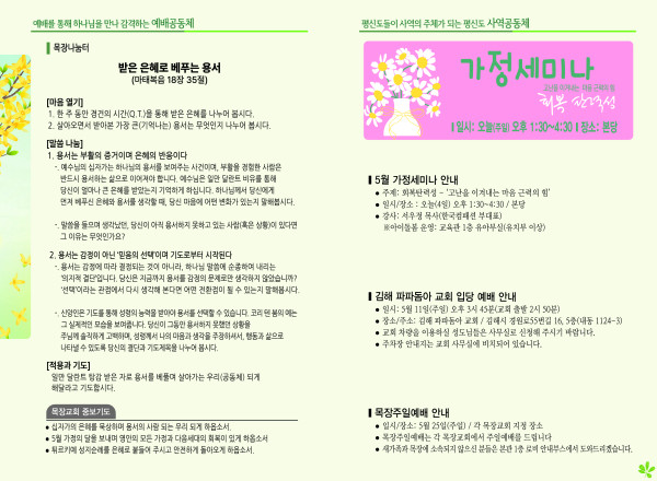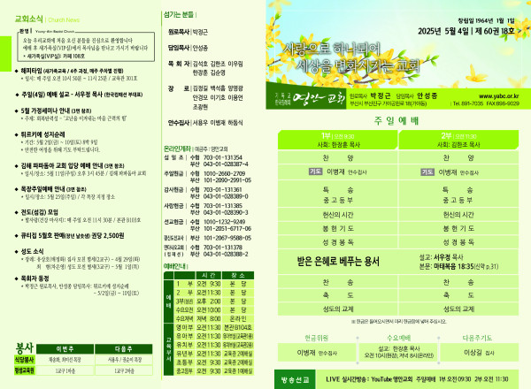 2025년 5월 4일 주보 페이지 정보 작성자 관리지기 작성일25-05-03 09:35 조회2,339회 댓글0건 관련링크 목록 본문 2025년 5월 4일 주보 댓글목록 등록된 댓글이 없습니다. 목록