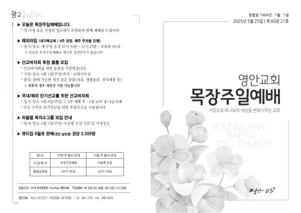 2025년 5월 25일 주보 페이지 정보 작성자 관리지기 작성일25-05-24 09:53 조회2,131회 댓글0건 관련링크 목록 본문 2025년 5월 25일 주보 댓글목록 등록된 댓글이 없습니다. 목록