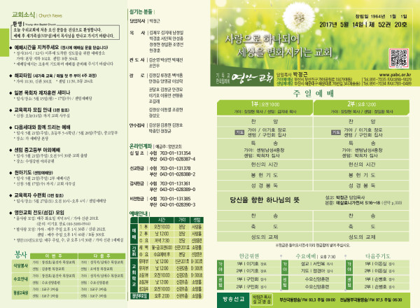 2017년 5월 14일 주보 페이지 정보 작성자 관리지기 작성일17-05-13 11:14 조회15,298회 댓글0건 관련링크 목록 본문 2017년 5월 14일 주보 댓글목록 등록된 댓글이 없습니다. 목록