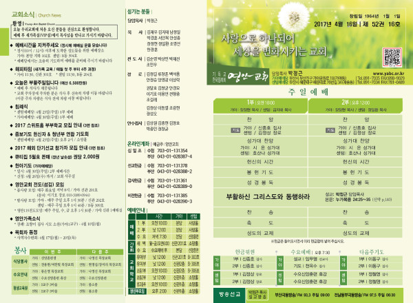 2017년 4월 16일 주보 페이지 정보 작성자 관리지기 작성일17-04-15 13:11 조회15,061회 댓글0건 관련링크 목록 본문 2017년 4월 16일 주보 댓글목록 등록된 댓글이 없습니다. 목록