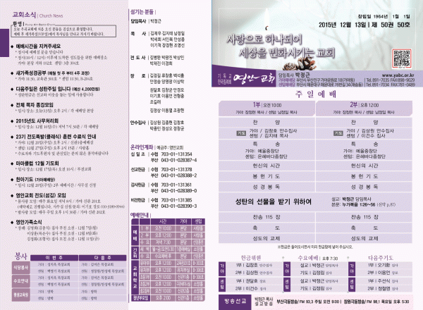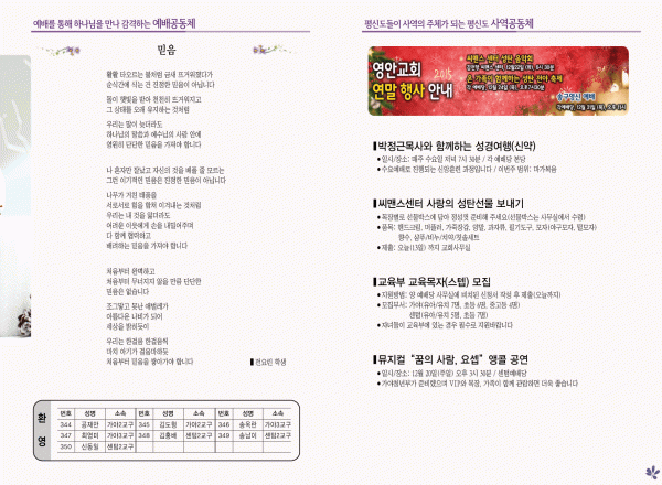 2015년 12월 13일 주보 페이지 정보 작성자 영안교회 작성일15-12-12 14:20 조회11,474회 댓글0건 관련링크 목록 본문 2015년 12월 13일 주보 댓글목록 등록된 댓글이 없습니다. 목록