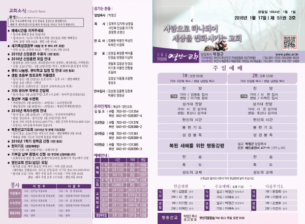 2016년 1월 17일 주보 페이지 정보 작성자 영안교회 작성일16-01-16 11:58 조회12,319회 댓글0건 관련링크 목록 본문 2016년 1월 17일 주보 댓글목록 등록된 댓글이 없습니다. 목록
