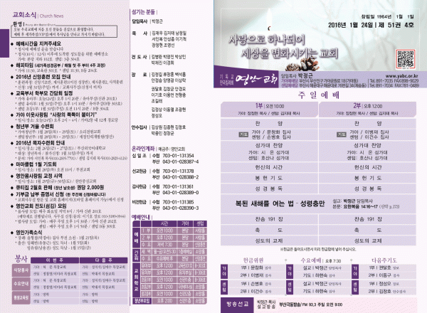 2016년 1월 24일 주보 페이지 정보 작성자 영안교회 작성일16-01-23 13:26 조회14,038회 댓글0건 관련링크 목록 본문 2016년 1월 24일 주보 댓글목록 등록된 댓글이 없습니다. 목록