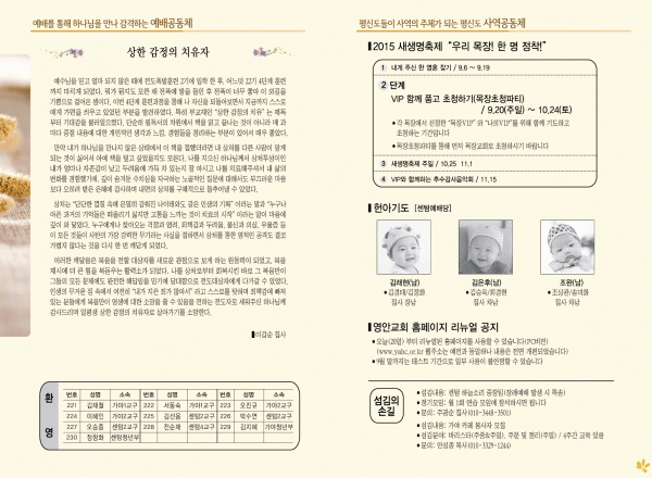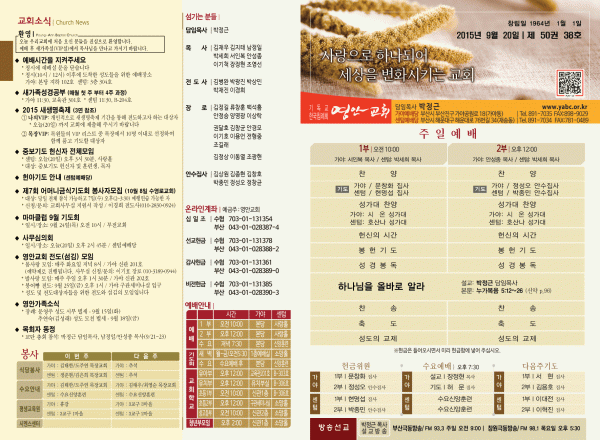 2015년 9월 20일 주보 페이지 정보 작성자 영안교회 작성일15-09-22 14:21 조회10,667회 댓글0건 관련링크 목록 본문 2015년 9월 20일 주보 댓글목록 등록된 댓글이 없습니다. 목록