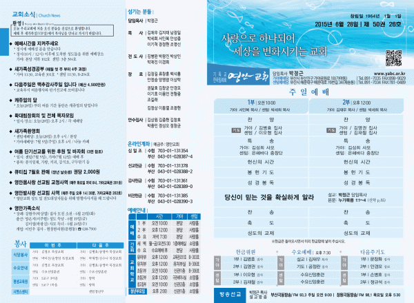 2015년 6월 28일 주보 페이지 정보 작성자 yabc 작성일15-06-27 00:00 조회10,849회 댓글0건 관련링크 목록 본문 2015년 6월 28일 주보 댓글목록 등록된 댓글이 없습니다. 목록