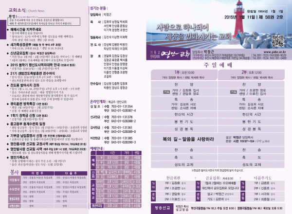 2015년 1월 11일 주보 페이지 정보 작성자 yabc 작성일15-01-10 00:00 조회10,232회 댓글0건 관련링크 목록 본문 2015년 1월 11일 주보 댓글목록 등록된 댓글이 없습니다. 목록