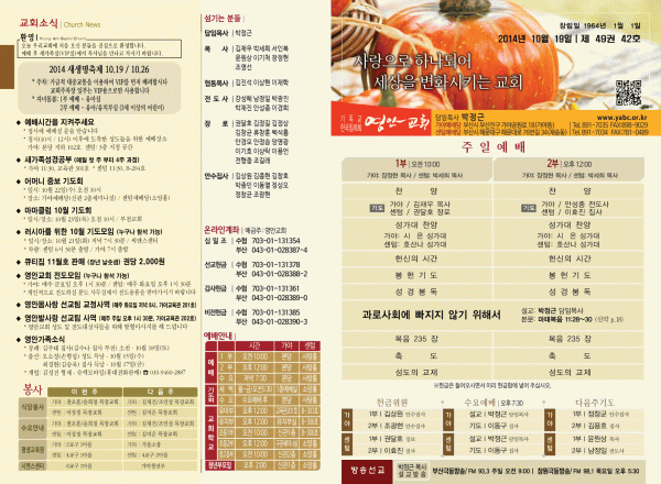 2014년 10월 19일 주보 페이지 정보 작성자 yabc 작성일14-10-18 00:00 조회11,796회 댓글0건 관련링크 목록 본문 2014년 10월 19일 주보 댓글목록 등록된 댓글이 없습니다. 목록