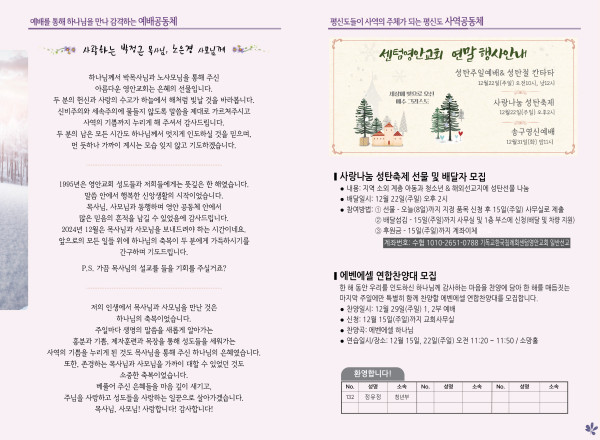 2024년 12월 8일 주보 (센텀예배당) 페이지 정보 작성자 관리지기 작성일24-12-07 10:30 조회2,518회 댓글0건 관련링크 목록 본문 2024년 12월 8일 주보 (센텀예배당) 댓글목록 등록된 댓글이 없습니다. 목록