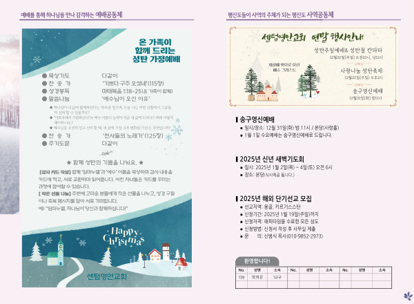 2024년 12월 22일 주보 (센텀예배당) 페이지 정보 작성자 관리지기 작성일24-12-21 11:04 조회2,536회 댓글0건 관련링크 목록 본문 2024년 12월 22일 주보 (센텀예배당) 댓글목록 등록된 댓글이 없습니다. 목록