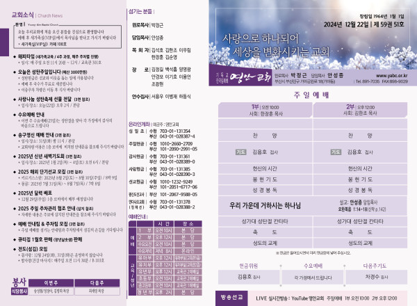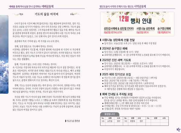 2024년 12월 22일 주보 (가야예배당) 페이지 정보 작성자 관리지기 작성일24-12-21 11:14 조회3,104회 댓글0건 관련링크 목록 본문 2024년 12월 22일 주보 (가야예배당) 댓글목록 등록된 댓글이 없습니다. 목록