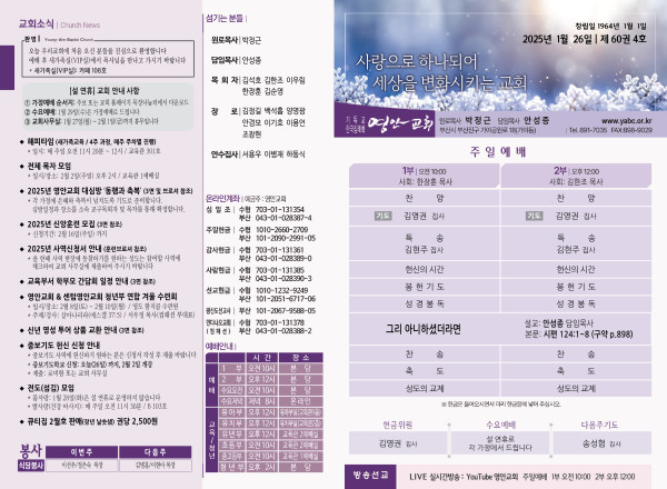 2025년 1월 26일 주보 페이지 정보 작성자 관리지기 작성일25-01-25 10:18 조회2,921회 댓글0건 관련링크 목록 본문 2025년 1월 26일 주보 댓글목록 등록된 댓글이 없습니다. 목록