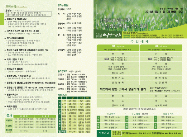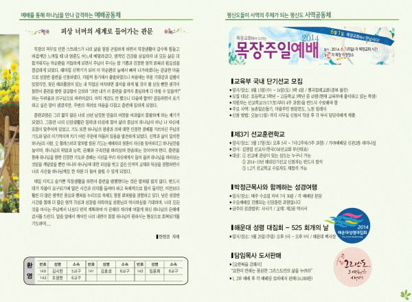 2014년 5월 11일 주보 페이지 정보 작성자 yabc 작성일14-05-10 00:00 조회10,566회 댓글0건 관련링크 목록 본문 2014년 5월 11일 주보 댓글목록 등록된 댓글이 없습니다. 목록