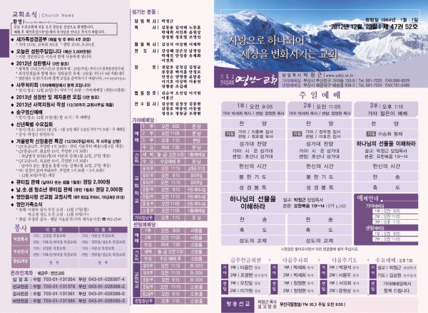 2012년 12월 23일 주보 페이지 정보 작성자 yabc 작성일12-12-22 00:00 조회11,085회 댓글0건 관련링크 목록 본문 2012년 12월 23일 주보 댓글목록 등록된 댓글이 없습니다. 목록