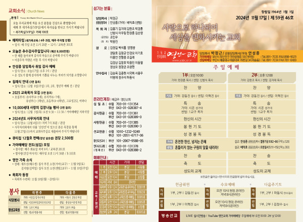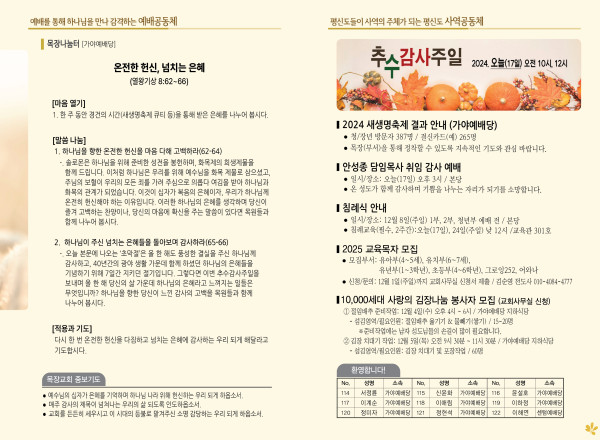 2024년 11월 17일 주보 (가야예배당) 페이지 정보 작성자 관리지기 작성일24-11-16 10:47 조회2,932회 댓글0건 관련링크 목록 본문 2024년 11월 17일 주보 (가야예배당) 댓글목록 등록된 댓글이 없습니다. 목록