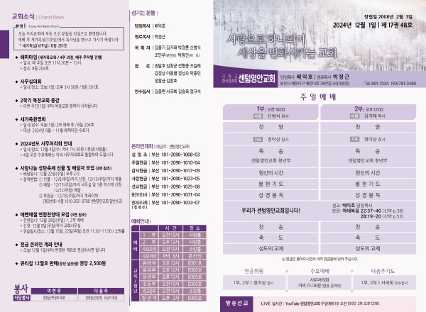 2024년 12월 1일 주보 (센텀예배당) 페이지 정보 작성자 관리지기 작성일24-11-30 09:39 조회2,587회 댓글0건 관련링크 목록 본문 2024년 12월 1일 주보 (센텀예배당) 댓글목록 등록된 댓글이 없습니다. 목록