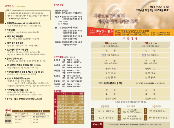 2024년 12월 1일 주보 (가야예배당) 페이지 정보 작성자 관리지기 작성일24-11-30 09:52 조회3,024회 댓글0건 관련링크 목록 본문 2024년 12월 1일 주보 (가야예배당) 댓글목록 등록된 댓글이 없습니다. 목록