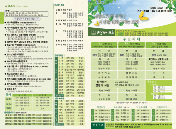 2011년 8월 14일 주보 페이지 정보 작성자 yabc 작성일11-08-13 00:00 조회11,330회 댓글0건 관련링크 목록 본문 2011년 8월 14일 주보 댓글목록 등록된 댓글이 없습니다. 목록