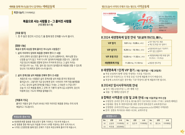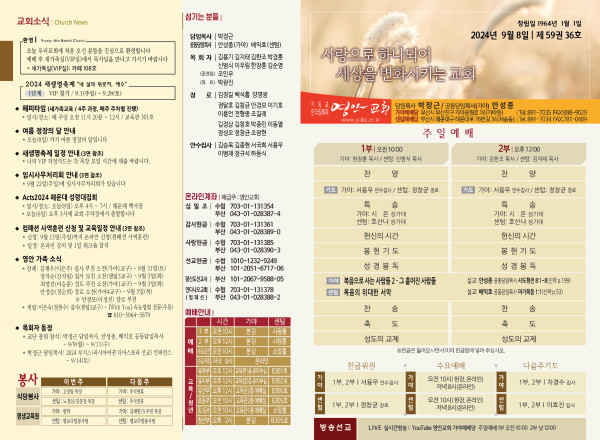 2024년 9월 8일 주보 (가야예배당) 페이지 정보 작성자 관리지기 작성일24-09-07 11:22 조회2,821회 댓글0건 관련링크 목록 본문 2024년 9월 8일 주보 (가야예배당) 댓글목록 등록된 댓글이 없습니다. 목록
