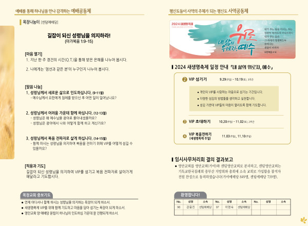 2024년 9월 29일 주보 (센텀예배당) 페이지 정보 작성자 관리지기 작성일24-09-28 10:40 조회2,732회 댓글0건 관련링크 목록 본문 2024년 9월 29일 주보 (센텀예배당) 댓글목록 등록된 댓글이 없습니다. 목록