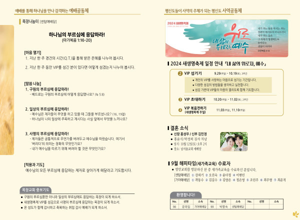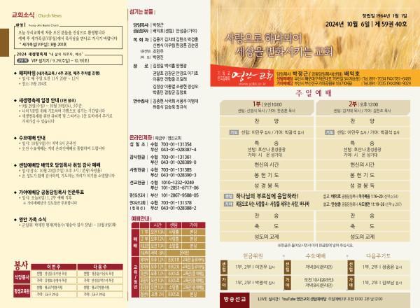 2024년 10월 6일 주보 (센텀예배당) 페이지 정보 작성자 관리지기 작성일24-10-05 10:44 조회2,654회 댓글0건 관련링크 목록 본문 2024년 10월 6일 주보 (센텀예배당) 댓글목록 등록된 댓글이 없습니다. 목록