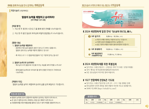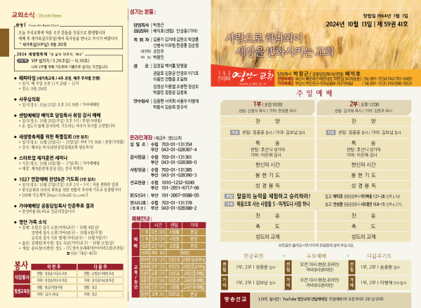 2024년 10월 13일 주보 (센텀예배당) 페이지 정보 작성자 관리지기 작성일24-10-12 10:25 조회2,613회 댓글0건 관련링크 목록 본문 2024년 10월 13일 주보 (센텀예배당) 댓글목록 등록된 댓글이 없습니다. 목록