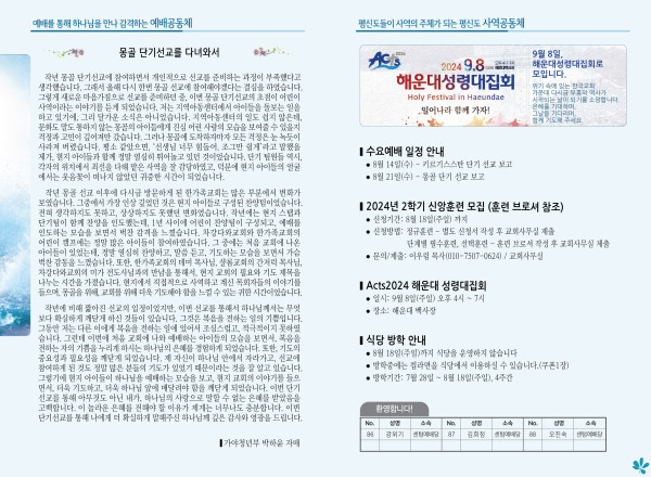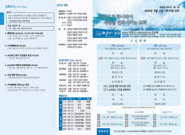 2024년 8월 11일 주보 (가야예배당) 페이지 정보 작성자 관리지기 작성일24-08-10 11:01 조회3,011회 댓글0건 관련링크 목록 본문 * 2024년 8월 11일 주보 (가야예배당) 댓글목록 등록된 댓글이 없습니다. 목록