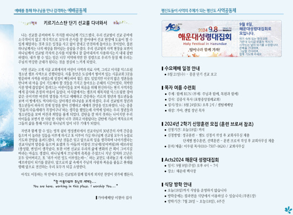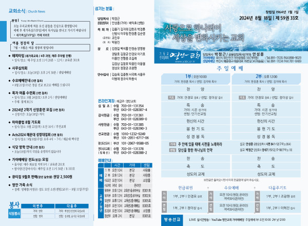 2024년 8월 18일 주보 (가야예배당) 페이지 정보 작성자 관리지기 작성일24-08-17 10:40 조회2,841회 댓글0건 관련링크 목록 본문 * 2024년 8월 18일 주보 (가야예배당) 댓글목록 등록된 댓글이 없습니다. 목록