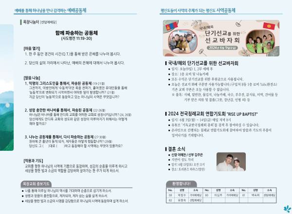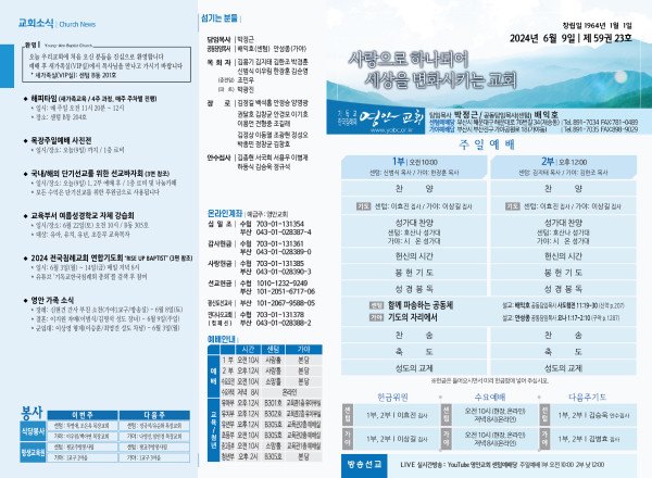 2024년 6월 9일 주보 (센텀예배당) 페이지 정보 작성자 관리지기 작성일24-06-08 10:44 조회3,010회 댓글0건 관련링크 목록 본문 2024년 6월 9일 주보 (센텀예배당) 댓글목록 등록된 댓글이 없습니다. 목록