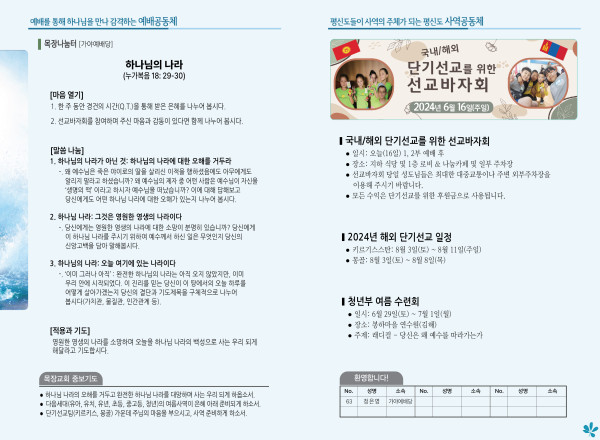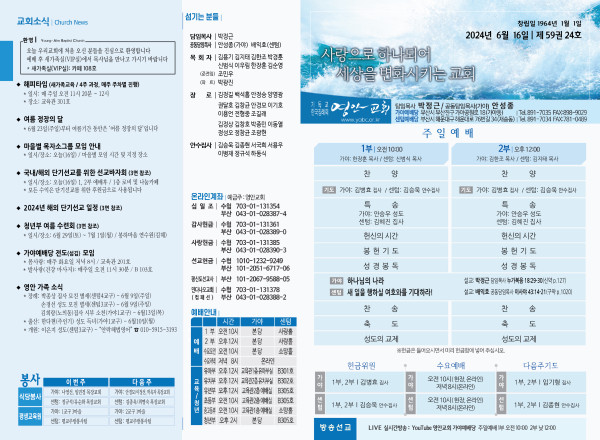2024년 6월 16일 주보 (가야예배당) 페이지 정보 작성자 관리지기 작성일24-06-15 10:51 조회3,603회 댓글0건 관련링크 목록 본문 2024년 6월 16일 주보 (가야예배당) 댓글목록 등록된 댓글이 없습니다. 목록