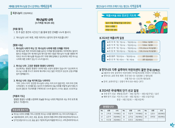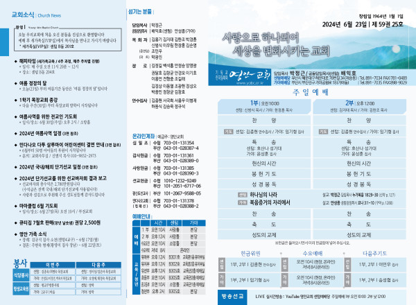2024년 6월 23일 주보 (센텀예배당) 페이지 정보 작성자 관리지기 작성일24-06-22 10:55 조회2,977회 댓글0건 관련링크 목록 본문 2024년 6월 23일 주보 (센텀예배당) 댓글목록 등록된 댓글이 없습니다. 목록