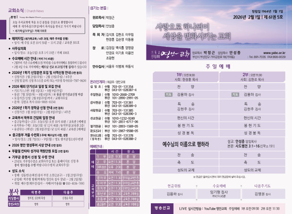 2026년 2월 1일 주보 페이지 정보 작성자 관리지기 작성일26-01-31 09:52 조회1,393회 댓글0건 관련링크 목록 본문 2026년 2월 1일 주보 댓글목록 등록된 댓글이 없습니다. 목록