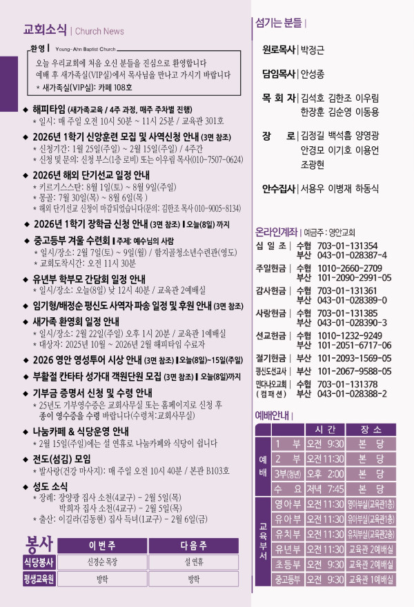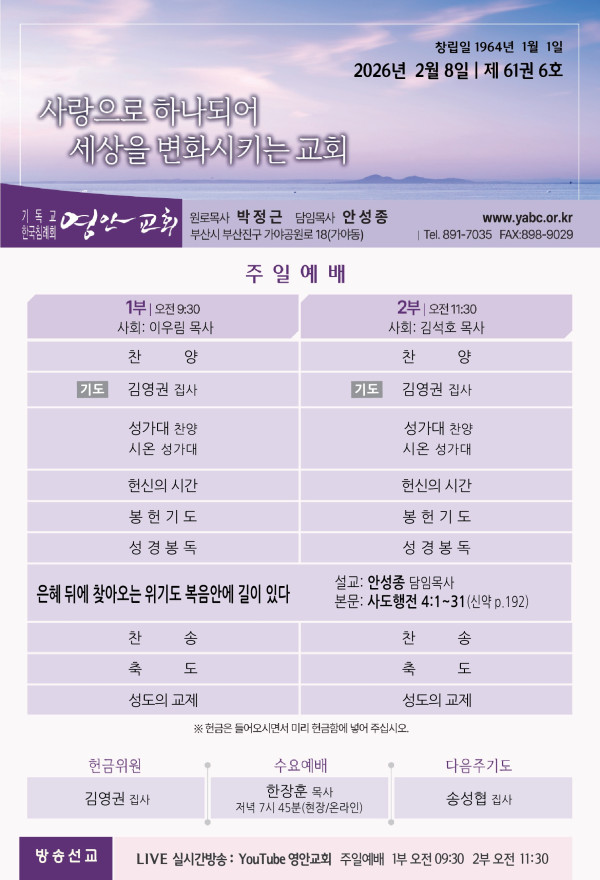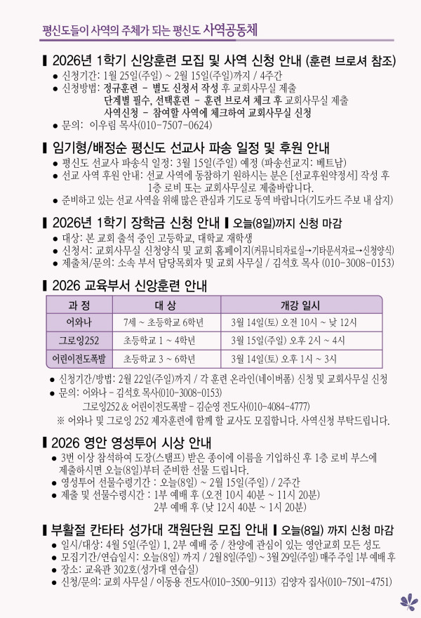 2026년 2월 8일 주보 페이지 정보 작성자 관리지기 작성일26-02-07 11:08 조회1,378회 댓글0건 관련링크 목록 본문 2026년 2월 8일 주보 댓글목록 등록된 댓글이 없습니다. 목록