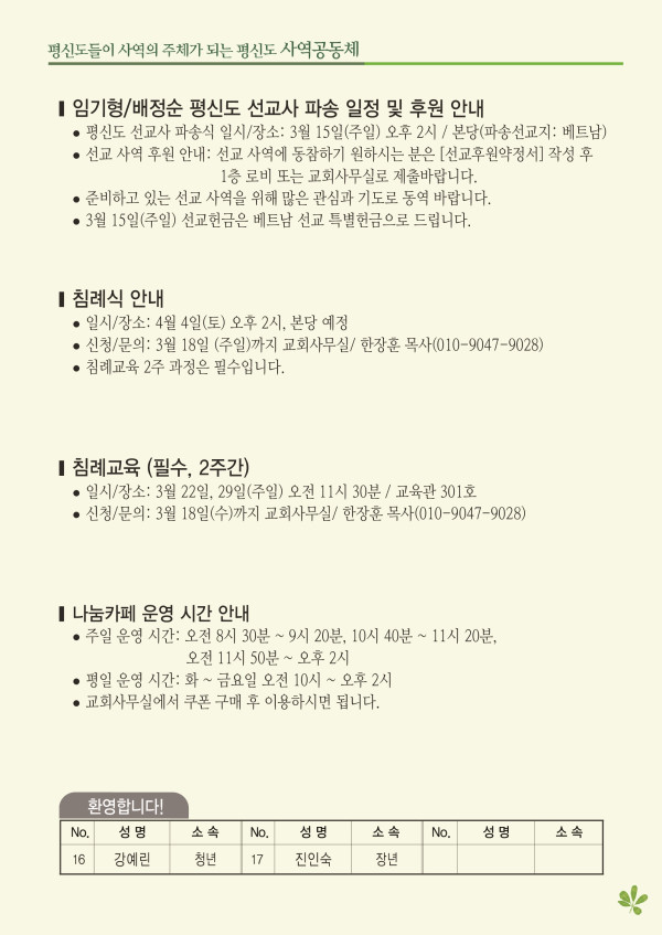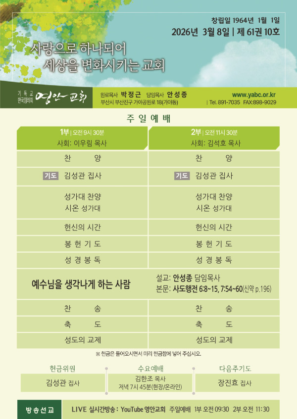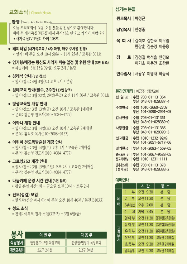 2026년 3월 8일 주보 페이지 정보 작성자 관리지기 작성일26-03-07 09:50 조회1,261회 댓글0건 관련링크 목록 본문 2026년 3월 8일 주보 댓글목록 등록된 댓글이 없습니다. 목록