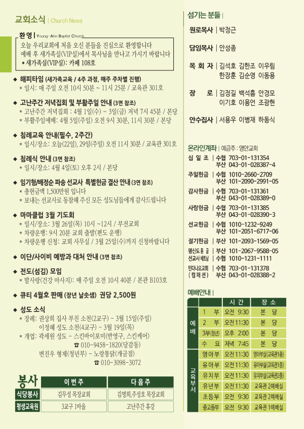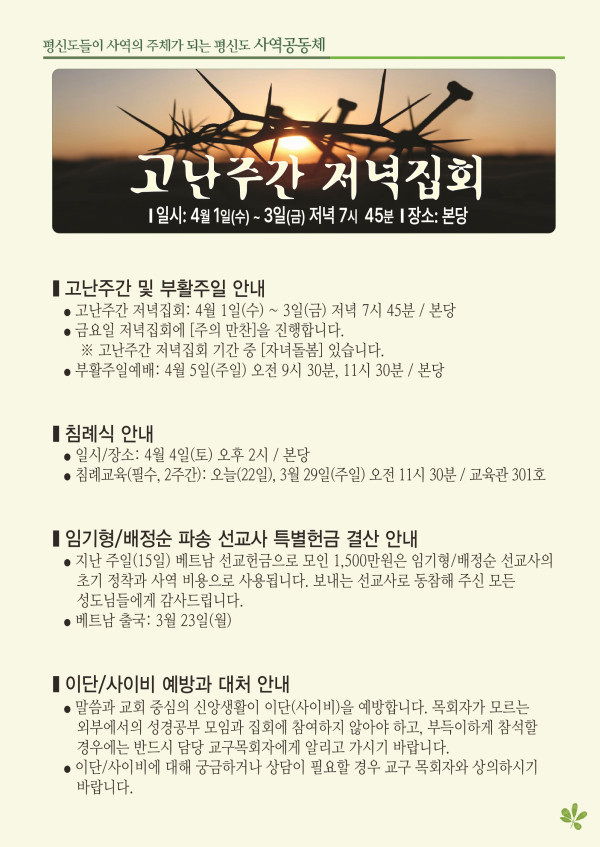 2026년 3월 22일 주보 페이지 정보 작성자 관리지기 작성일26-03-21 10:38 조회994회 댓글0건 관련링크 목록 본문 2026년 3월 22일 주보 댓글목록 등록된 댓글이 없습니다. 목록