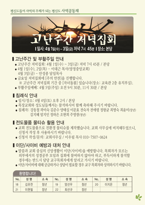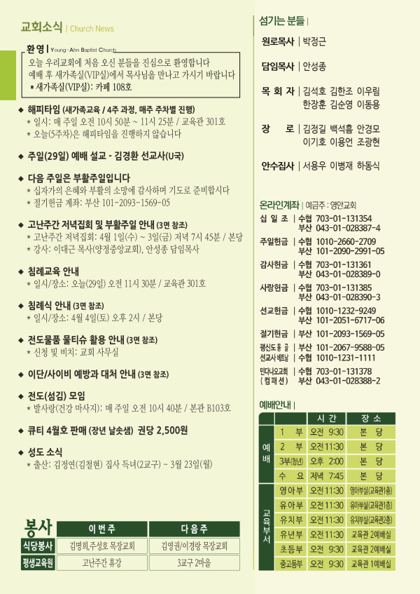 2026년 3월 29일 주보 페이지 정보 작성자 관리지기 작성일26-03-28 10:21 조회769회 댓글0건 관련링크 목록 본문 2026년 3월 29일 주보 댓글목록 등록된 댓글이 없습니다. 목록